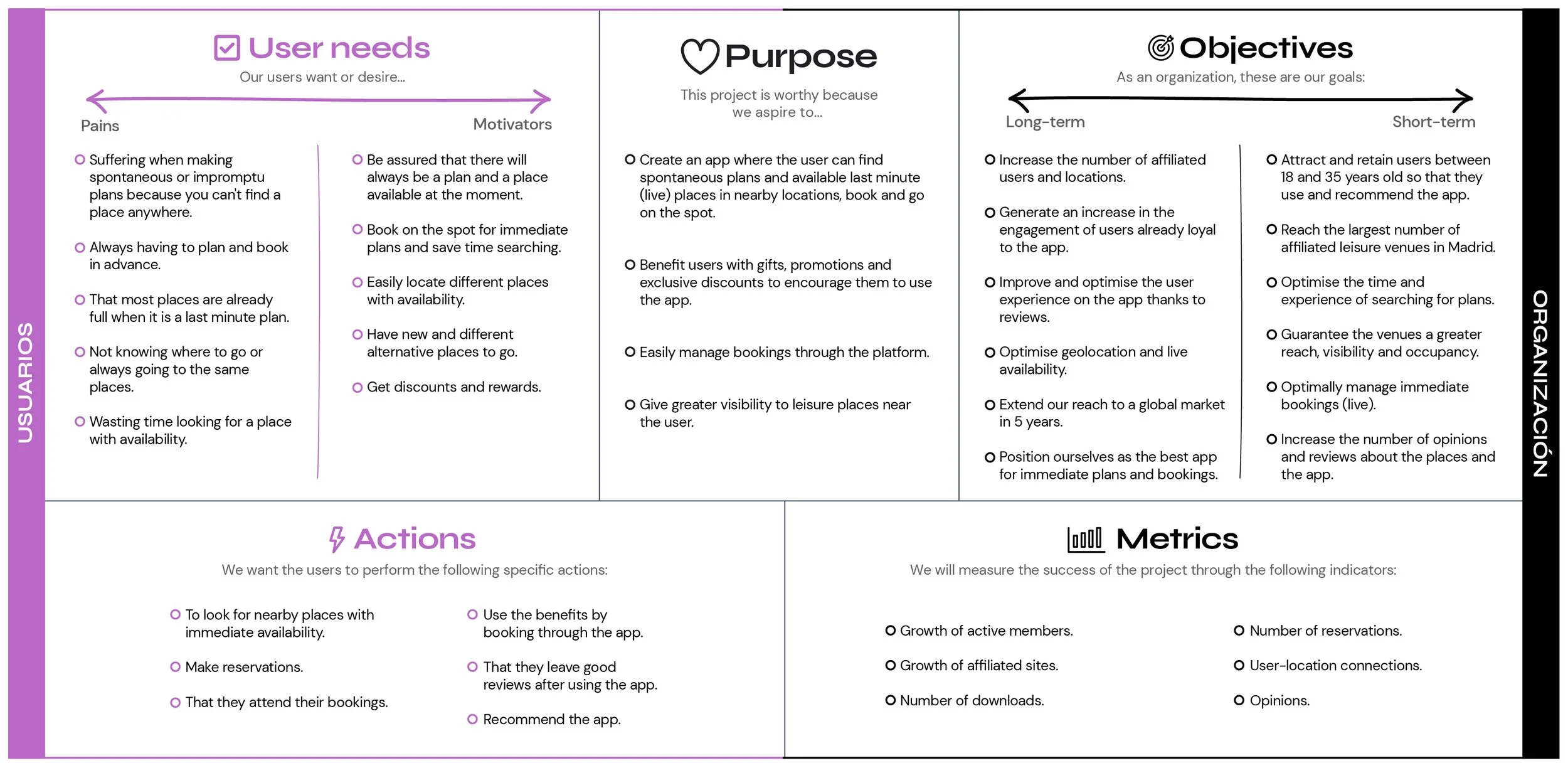The scope canvas is a Canvas specialized in connecting user needs with business objectives. It is a tool designed as the backbone of User Experience and Service Design projects.